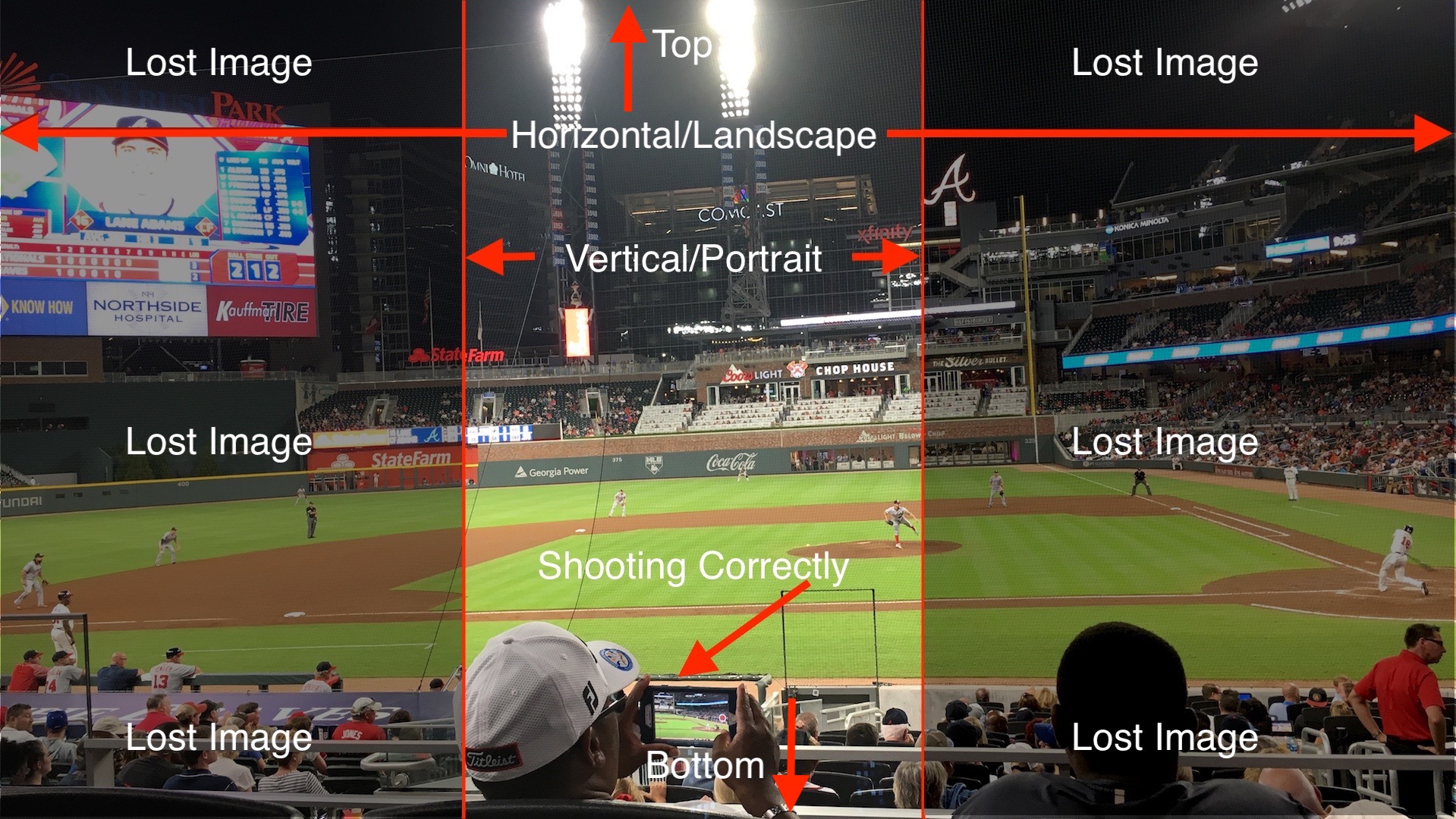 The entire frame is shown for both Landscape/horizontal and portrait/vertical. This is about understanding absolute aspect ratios and not related to relative framing. Landscape/horizontal is the same aspect ratio as a TV at 1.78:1 (1.78 width times 1 hight) or 16/9 (16 by 9) and when you shoot in portrait/vertical the aspect ratio is 0.56:1 (0.56 [14/25 fraction] width times 1 hight) or 9/16 (9 by 16).Now show lost top and bottom in landscape.