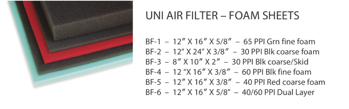 Most motorsport air filter manufacturers like UNI sell sheets of foam air filter material. Their BF-1 offers the smallest cell size — and therefore the best filtration.