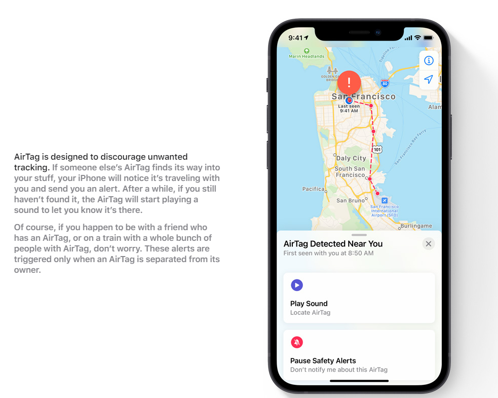 "AirTag is designed to discourage unwanted tracking. If someone else’s AirTag finds its way into your stuff, your iPhone will notice it’s traveling with you and send you an alert. After a while, if you still haven’t found it, the AirTag will start playing a sound to let you know it’s there.