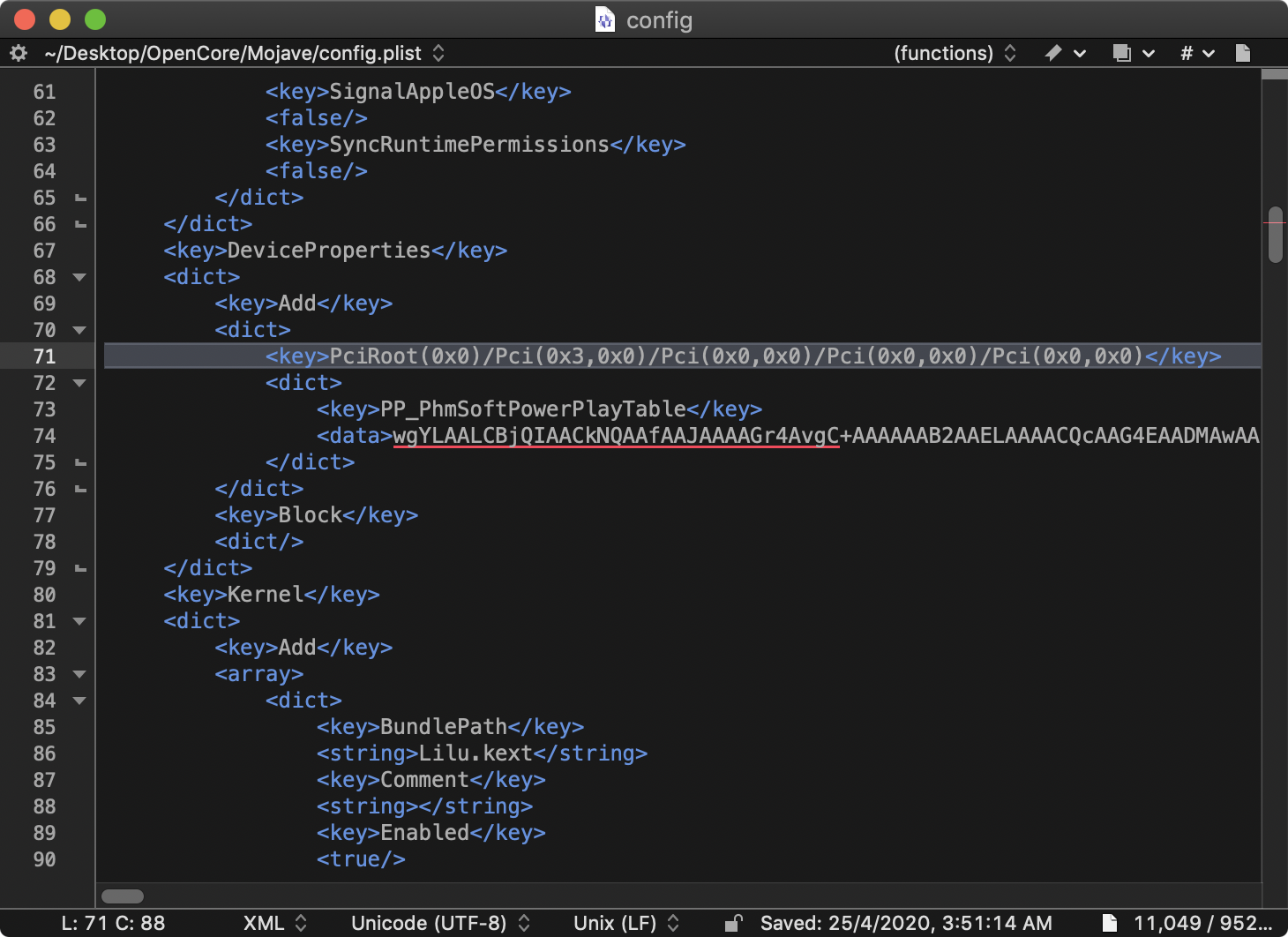 e) Search "<key>PP_PhmSoftPowerPlayTable</key>", then there is a very long Base64 code under it. Replace that Base64 code by your own code (from step 0), and save it.