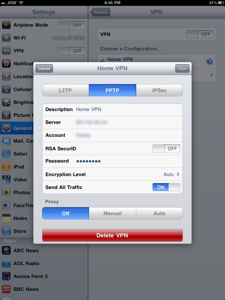 15. On the iPad click General/Network/VPN/Add VPN Configuration.