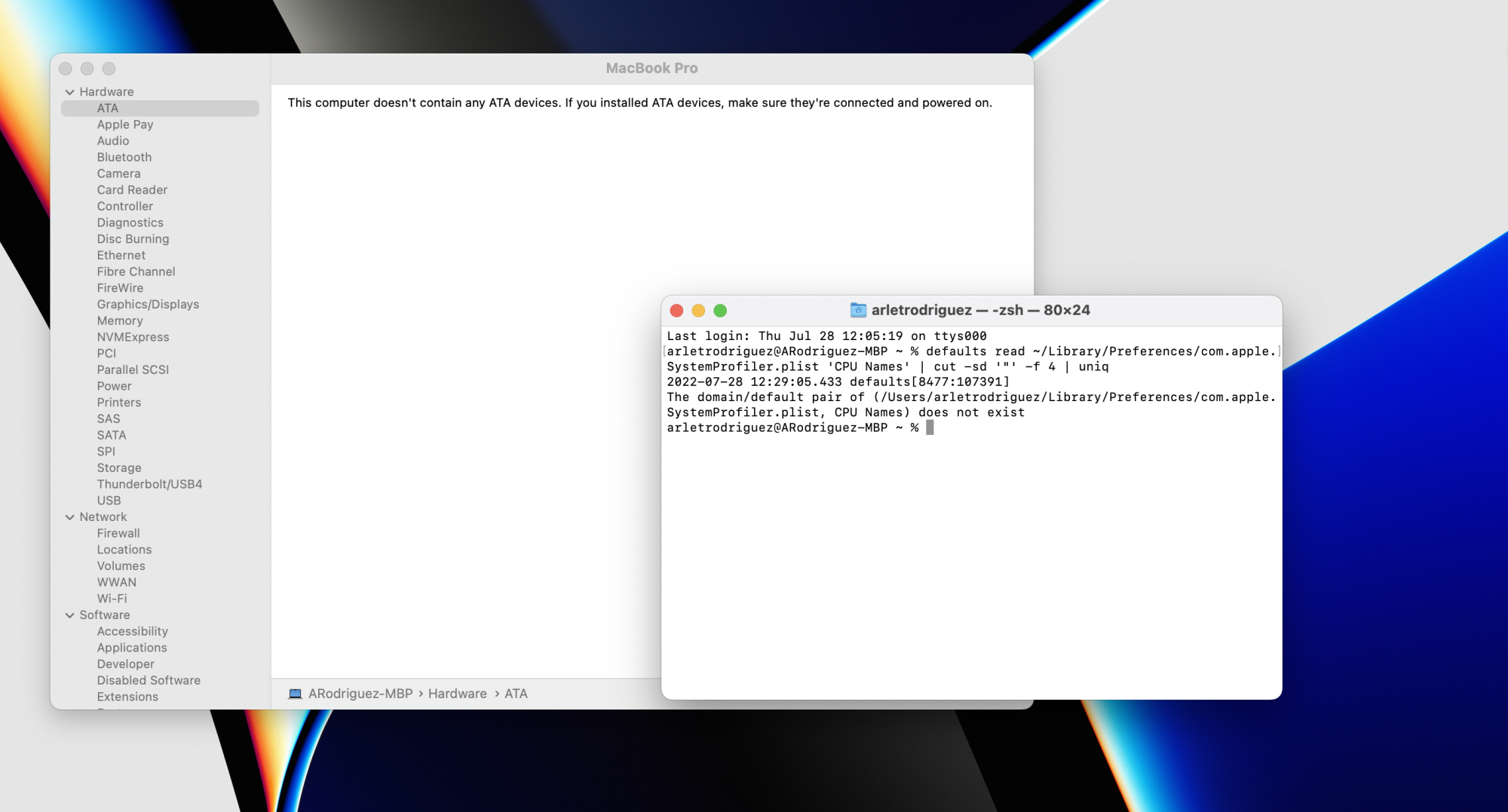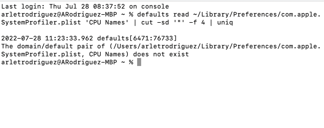 I then re-executed the terminal command, "defaults read ~/Library/Preferences/com.apple.SystemProfiler.plist 'CPU Names' | cut -sd '"' -f 4 | uniq" but it tells me that CPU Names doesn't exist.