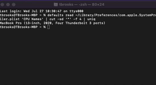 defaults read ~/Library/Preferences/com.apple.SystemProfiler.plist 'CPU Names' | cut -sd '"' -f 4 | uniq