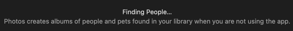 In the Photos App I have had this message in the "Peoples" section for months. Library has 85K photos and 6K videos. I thought that after a couple weeks it would disappear but it hasn't. The last time I added anything to the library was 3 months ago.