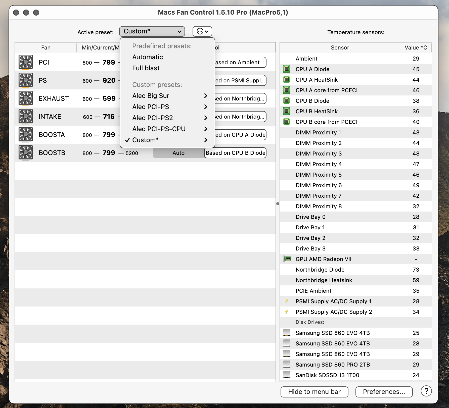I petty much keep the same profile.@h9826790 5 years later, with much more hungry GPUs, do you still use Macs Fan Control? Have your settings evolved? I reinstalled it on a clean Mojave and realised that PSU 2nd Component has changed its name.
