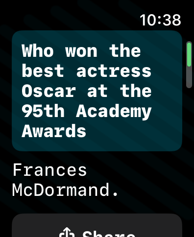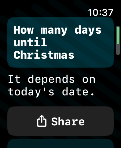 If you have a query but all you have to hand is your watch, Petey can provide an answer to your question, and the responses are often far more impressive than any digital assistant is capable of. You can even have the answers read out loud with Text to Speech, and you can share the outcome of your interaction via text, email, or social media.