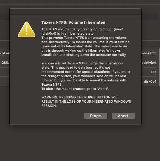 You need to go back to Bootcamp and make sure that you shut down Windows rather than put it to sleep or hibernate it, just as the Tuxera dialog says.When starting Mojave the Bootcamp volume is grayed out. When traying to activate it through disk Utility I receive a message it is hibernated. I cannot write in it or change anything. I use Tuxera NTFS. Any help will be very wellcome.