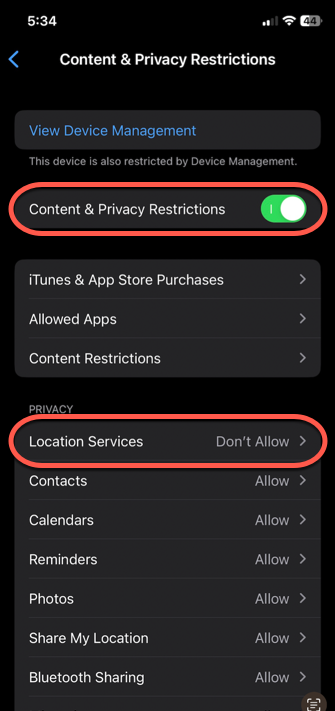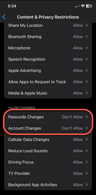 2. Enable Content & Privacy Restrictions (you will be required to enter a new passcode). Enter a passcode that you will remember but is different from the passcode that you use to unlock your phone.