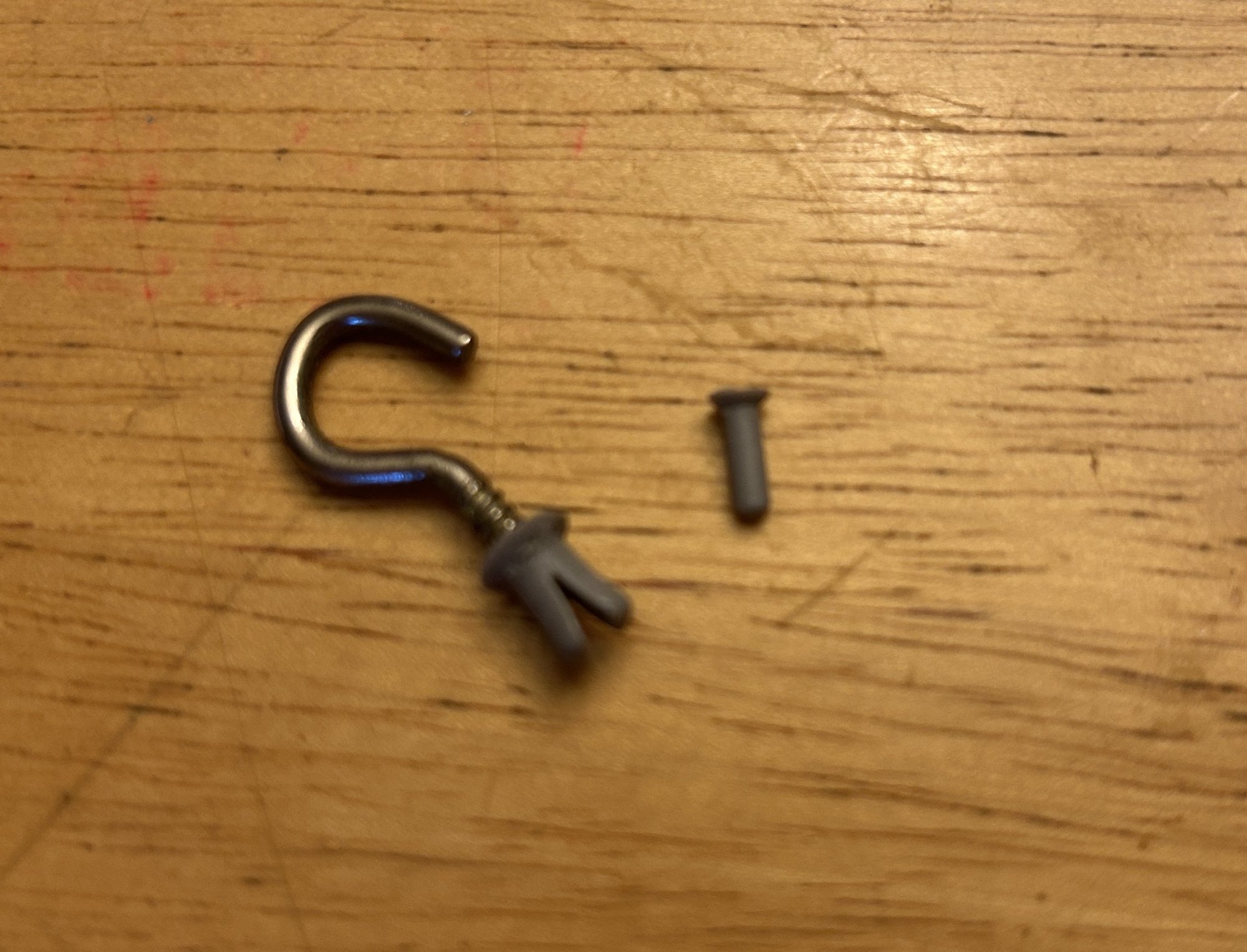 2. Get a small self-tapping eye-ring bolt hook (one that looks like a question mark) and slowly insert it where the pin was once. Turn it about 2-3 times until you can feel that it's threaded. Then, wiggle it back and forth to loosen it up and finally pull it straight up.