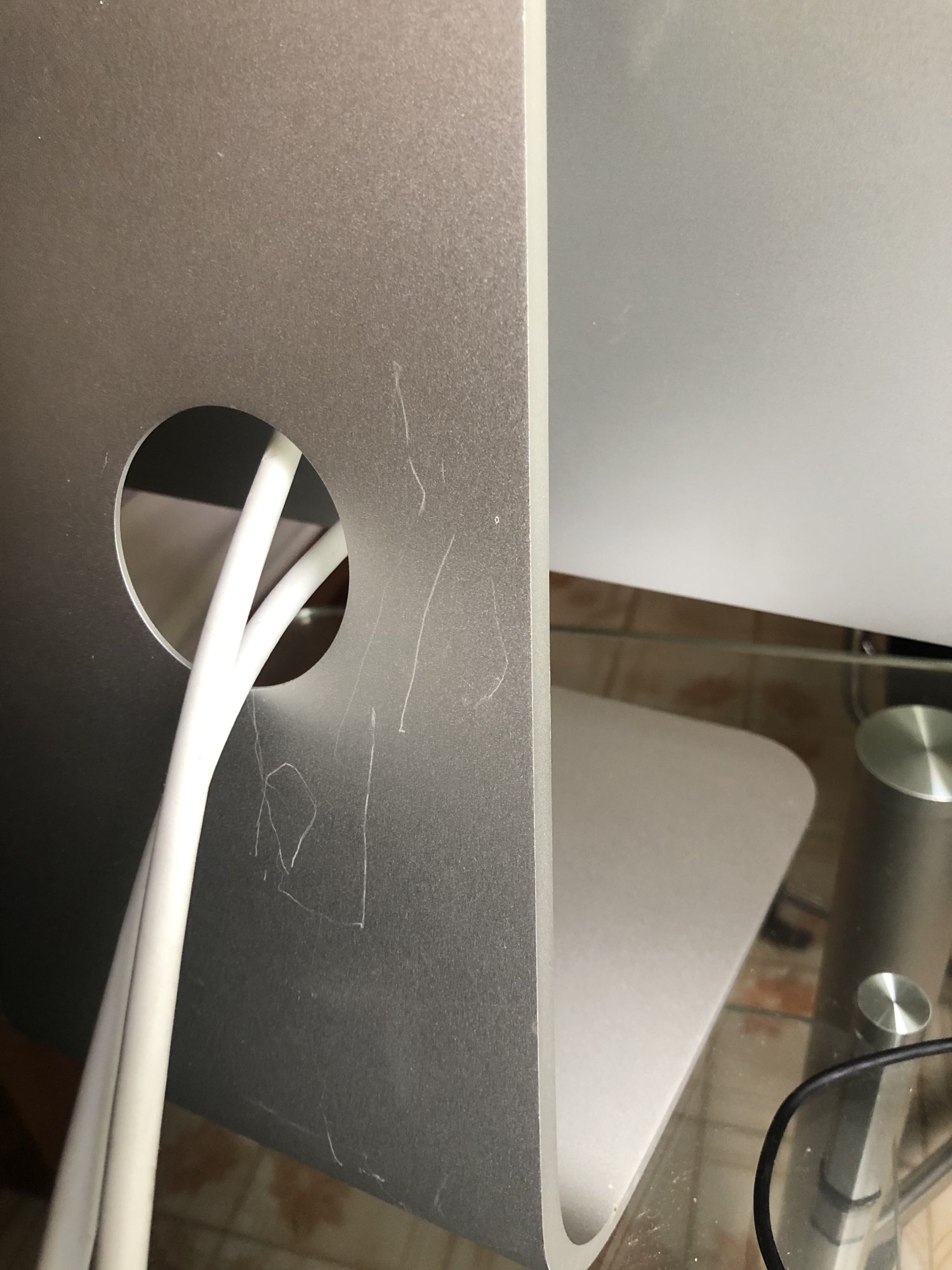 Recently I bought a second hand Apple Thunderbolt Display (27 inches) which came with several scuff and scratches in its base (please see the attached picture) and I would like to remove/polish/hide them but without damaging the surrounding areas of the aluminum. What product would you recommend for this based on your personal experience?