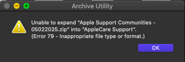 E EDLIU macrumors regular Original poster Oct 20, 2015 238 8 May 9, 2025 #3 bogdanw said: If they are in iCloud Drive, move them on the Mac's drive and try again. If it still doesn't work, try with The Unarchiver https://apps.apple.com/app/the-unarchiver/id425424353 or Keka https://github.com/aonez/Keka/releases Click to expand... Nope. Doesn't work. I can't open the "WebChat Support Transcript.zip" file.