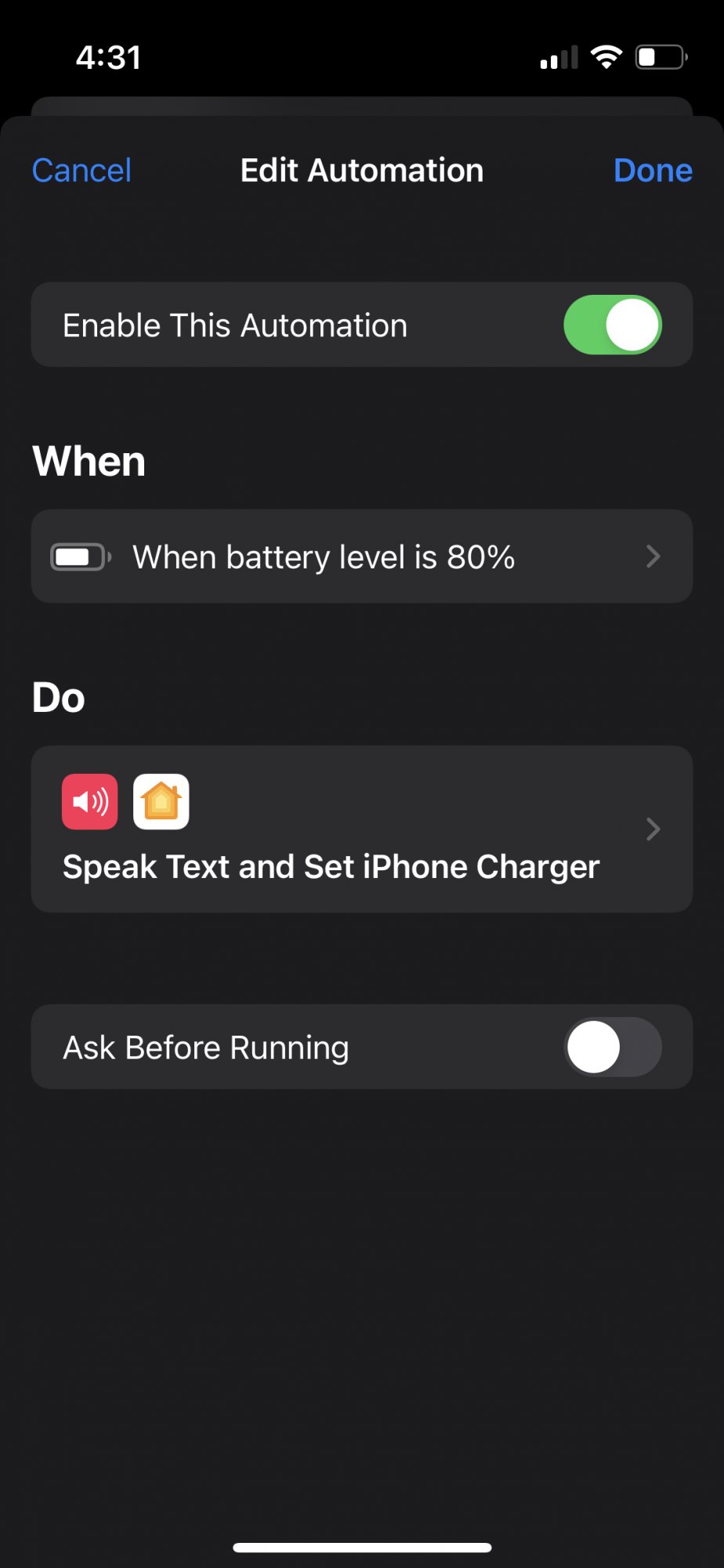 I don’t have to use the speak function right? I’ll give it a shot and hopefully it works, my phone finally went under 80%.Automation for turning off charging plug after x percent.