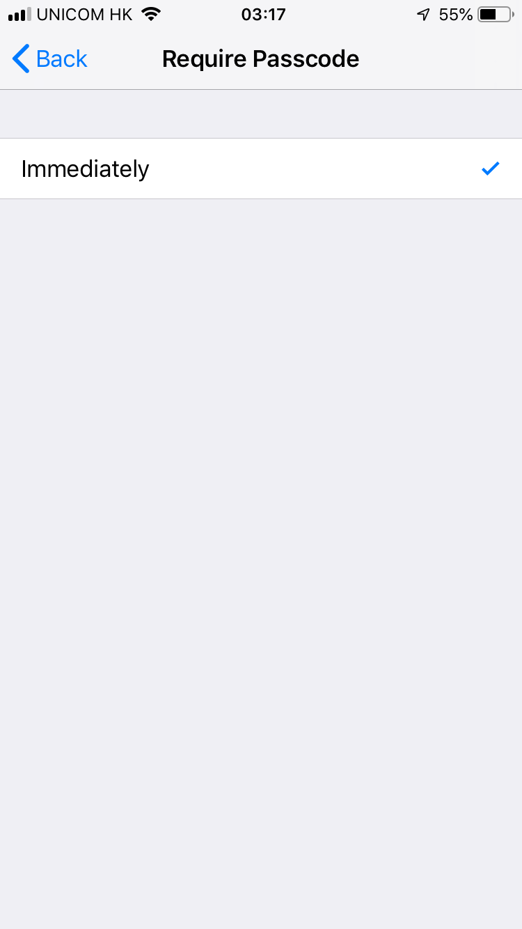 - To set the passcode lock delay, locate the button where you see Require Passcode. By default you will see “Immediately” next to Require Passcode. This means that as soon as your device locks, your passcode will be enabled. If you want to delay this, tap on the button and select After 1 minute, After 5 minutes, or After 15 minutes.