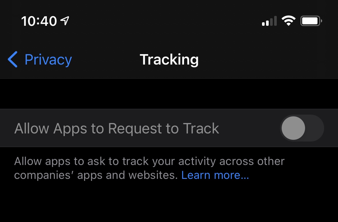 Depending on your prior privacy settings, this toggle may have already been turned off on your device. If it wasn't, this will make sure that you don't see tracking request popups and that apps aren't able to access your IDFA.