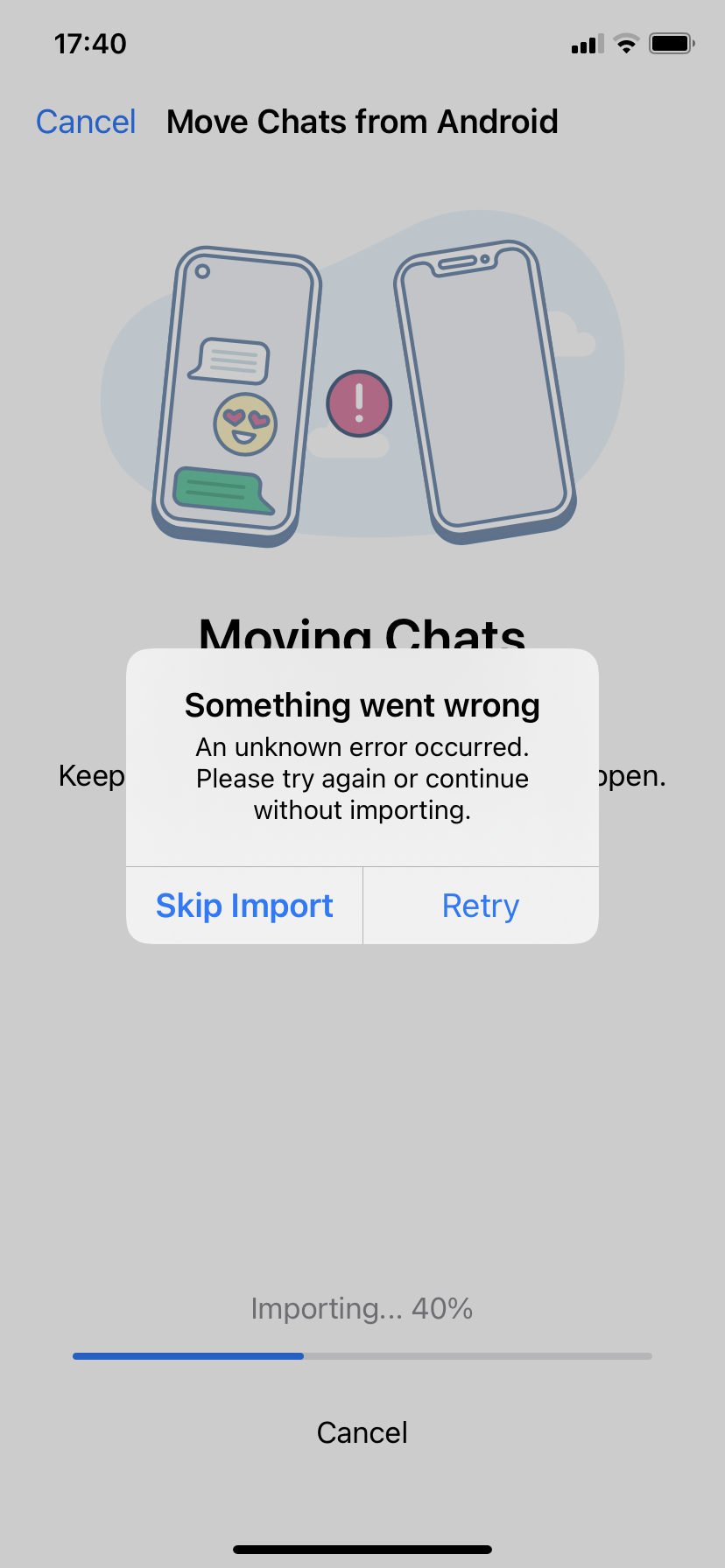 PixelPoetry said: This process doesn't work. WhatsApp doesn't appear as an option on the Transfer Data screen. If anyone has done this successfully please let me know! Click to expand... I initially had this issue, but solved by updating to the latest iOS. However, at the final stage I get this 😕