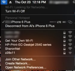 Last night though, I was at a meetup, and after using my phone to look something up, I decided it would be easier to pull out my laptop and tether it. I locked the phone, put it in my pocket and pulled out my laptop, opened it, and checked the WiFi menu. No personal hotspot. I waited and tried again. Nope, still not there. I pulled out my phone and unlocked it. Still nothing. I switched to the personal hotspot section in settings. I checked again. My phone showed up in the WiFi menu, in the same section as a bunch of other WiFi nets in the building, and yet, it knew it was an iPhone, because it had the linked chain icon.
