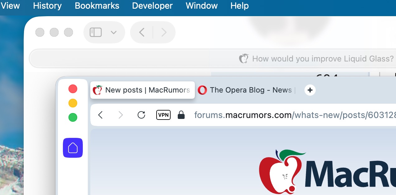 Comparing two web browsers using the same "liquid glass" effect: Opera Developer is at the front, while Safari is at the back. The curvature of the corners should be more subtle; I believe Opera handles that curve much better. It also handles the "liquid glass" effect much better.