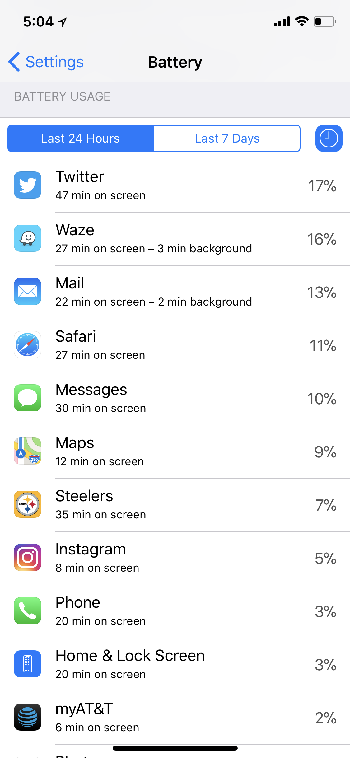 This is what I ended up with today, currently have 7% left. Still not getting the crazy numbers that some of you are getting but I know usage varies due to cellular connection and all of that. Been ok WiFi all day. If you guys say it’s normal then I won’t worry about it. Thought about doing a clean wipe and then setting it up as new. Also the 2 front runners using the most battery life are the usual suspects.
