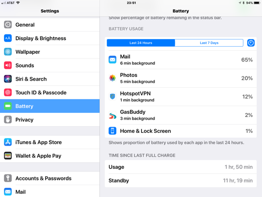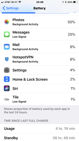 I didn't invert screen colors, or make any changes to my typical and previously listed location, background app refresh, animations, or push mail settings. I kept the screen dim but everything was the same as in my battery tests the past few days. It also turns out my lock screen is set for perspective not still, as previously thought, so it moves as I move the phone which uses more power than still lock screen photos.