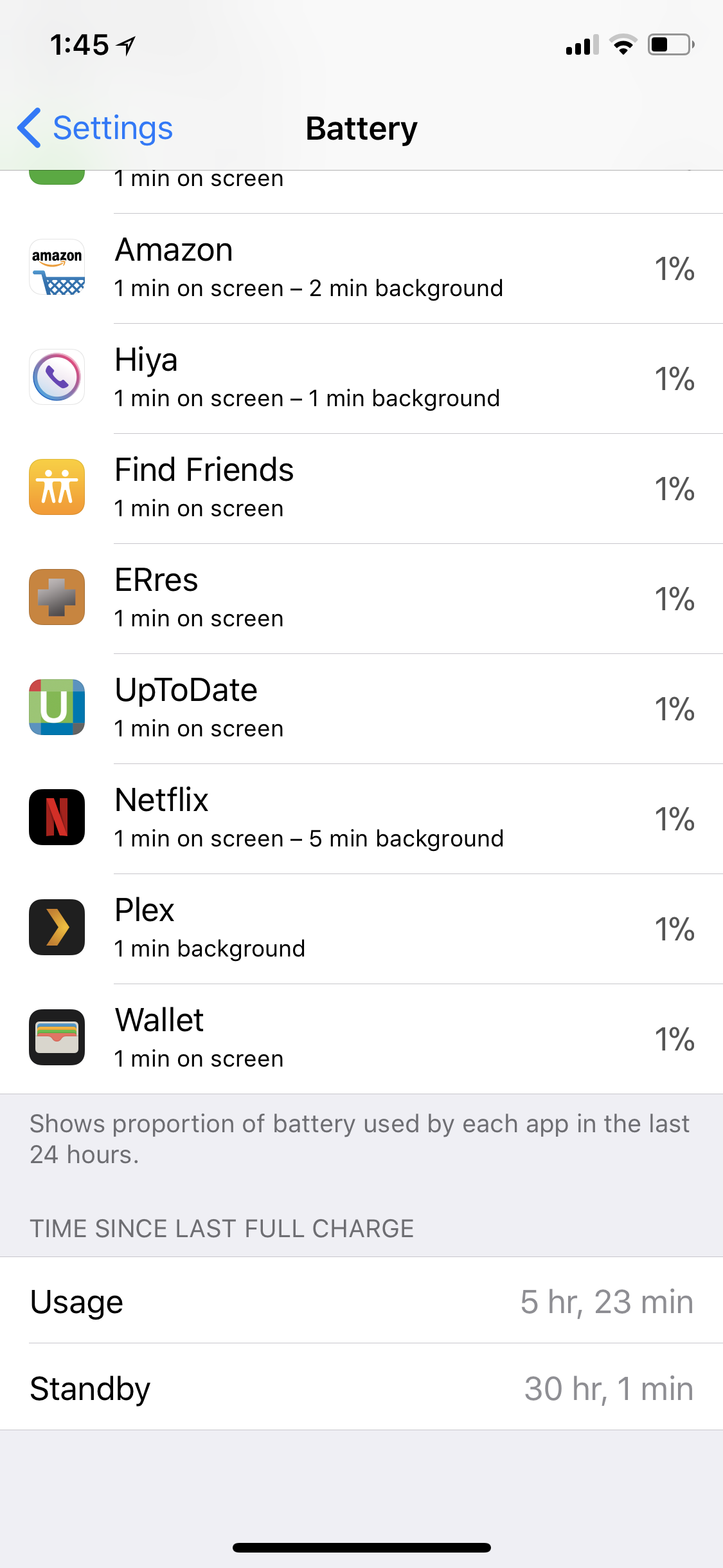 (4) I turned off background app refresh for about 200 of my apps (esp Facebook), but I still have it turned on for 82 of my apps - including but not limited to 1password, amazon, amazon music, xfinity connect, dropbox, ebay, fandango, fantastical, flickr, gmail, google maps, healthmate, ibooks, instagram, kindle, macID, maps, messenger, misfit, movies anywhere, news, next-door, nook, notes, outlook, pinterest, flex, podcasts, pockemon go, Ring, Skype, snapchat, spotify, starbucks, Subaru Starlink, weather channel, twitter, venmo. wave, weather, yelp, youtube (I use the app when plugged in).