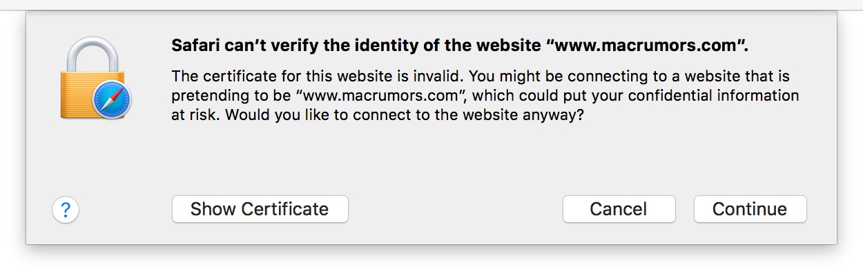 Can you click on show certificate and send a screenshot to arn@normalkid.comEvery time I try to open macrumors.com using Safari on my MacBook Pro, i get this popup window: