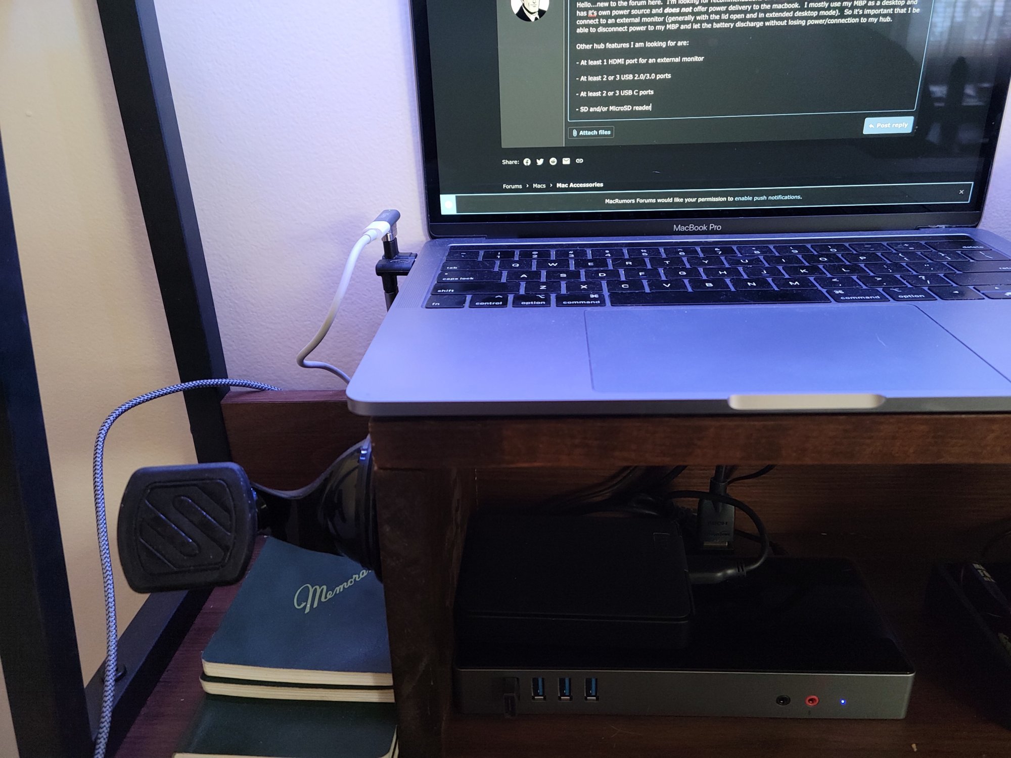 Here's the gist...I have my 2019 MBP connected to an external monitor in extended desktop mode. My laptop rarely leaves my desk other than for travel, so I need a hub that has it's own power supply (which mine does) that allows me to use my laptop and monitor without the charging cable plugged into the MBP. The hub connects via USB C to the forward USB C port on the MBP and I connect the charging cable to the Thunderbolt 3 port at the rear. I've attached a pic of the set up in case I didn't explain clearly. Hub at the bottom connects via USB C to the forward port on the MBP. MBP charging cable connects to the rear port (it is connected with a mag adapter and a 90 degree USB C adapter)