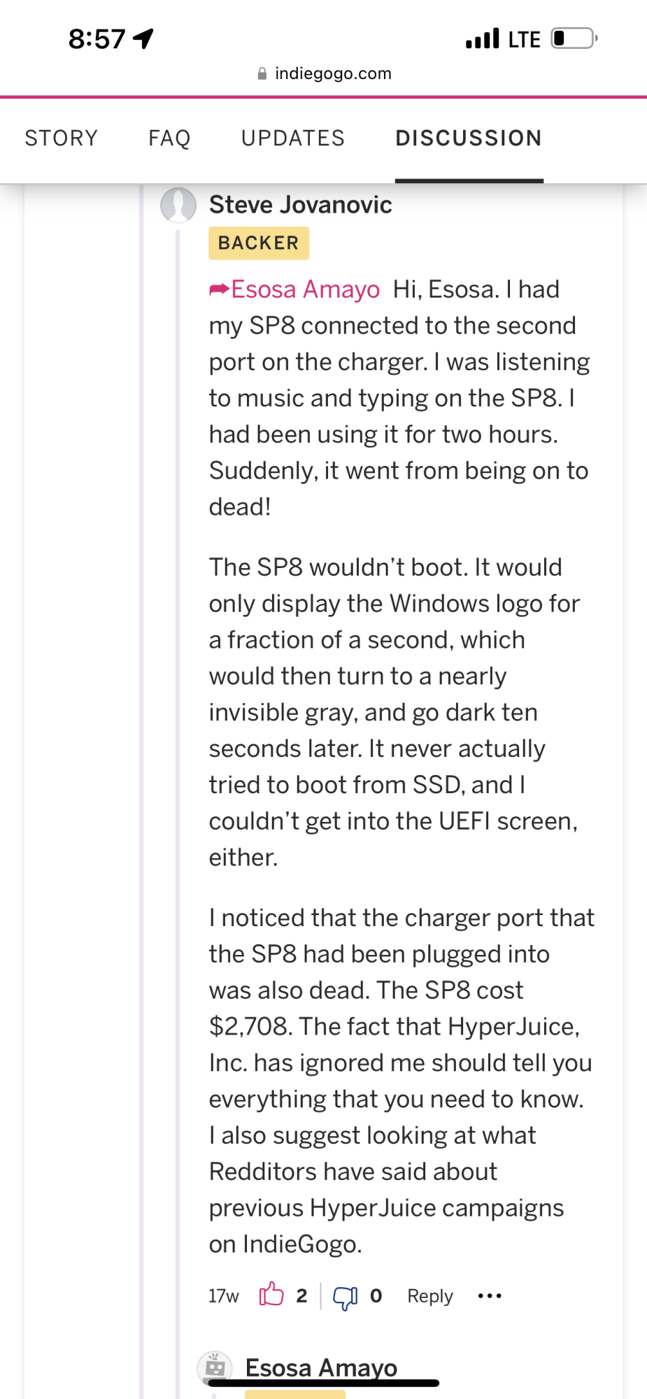 - And then the biggest offender. Their campaign updates. For those who don’t know, when you fund stuff on Indiegogo, there’s a section called “updates” which is where they update the backers on the status of things and if they’re on track or if they ran into roadblocks. When they update this, if you opt to (I think it’s on by default) we are all sent an email with the subject being: “Update #x: 245w Gan Charger & USB-C battery bank” with the body of the post. So while we were already annoyed by the lack of communication, they would use that TO PROMOTE NEW CAMPAIGNS AND PRODUCT LAUNCHES. And then we would all collectively say: “we’ve been asking for a real status update and instead you’re using the update of the campaign to push new stuff and not answer us, while your last promise was unfulfilled”