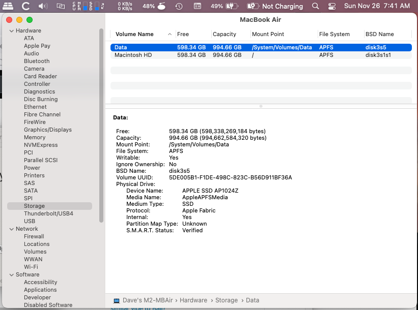 [ EDIT: 11/26 8am, I added screen shots of System Report > Storage > Data (& Macintosh HD). I thought about running Disc Util. First Aid, but not sure which level to do that on. ]