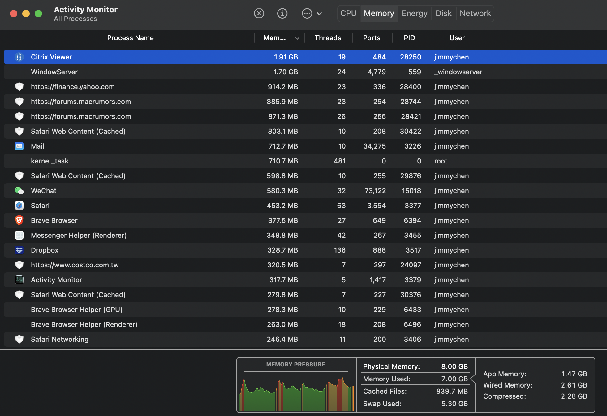 - a few Safari tab opens, with Yahoo Finance running (memory hog), a few Macrumors page, FB pages (memory og)...etc.