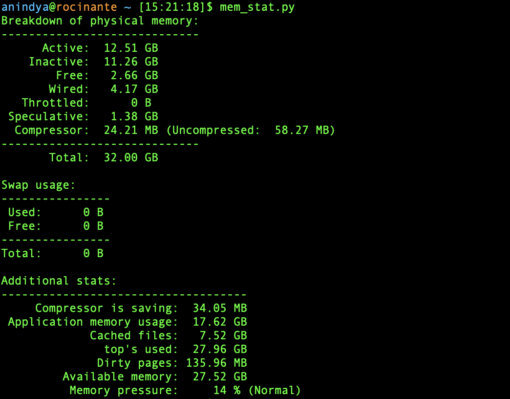 I have been writing a small tool (99% Python + 1% C) to give me a summary of memory usage on the system, as part of my research into Darwin (I mainly work on some stuff for OpenBSD when free but spending more time on macOS as well these days). This is how it looks: