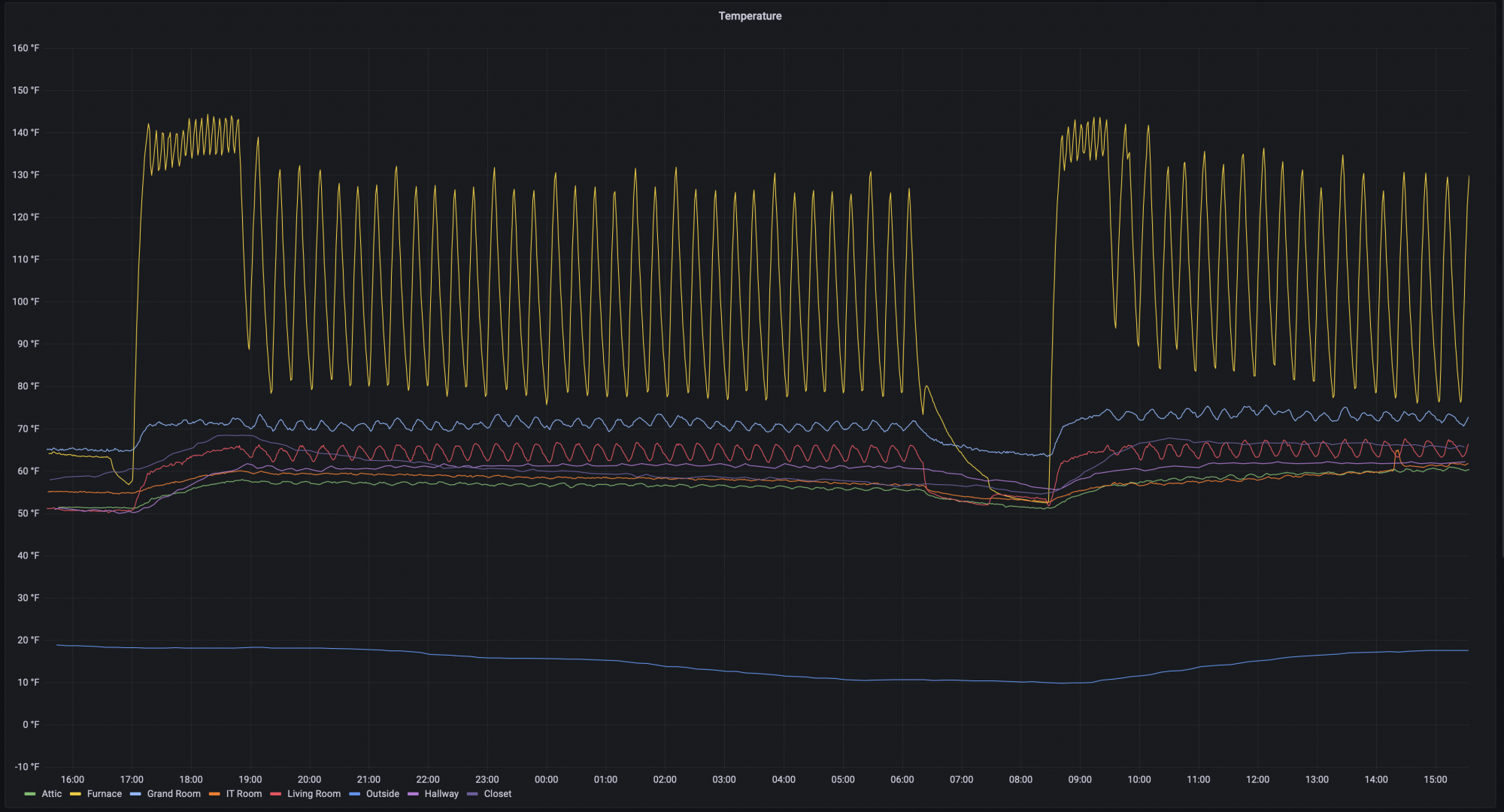 I thought you all might like a little look at some data. The big yellow spike at the start of this chart is when the furnace was fixed and fired back up. At around 0630 the pilot light went out, I relit it when I woke up and looked at the graph.