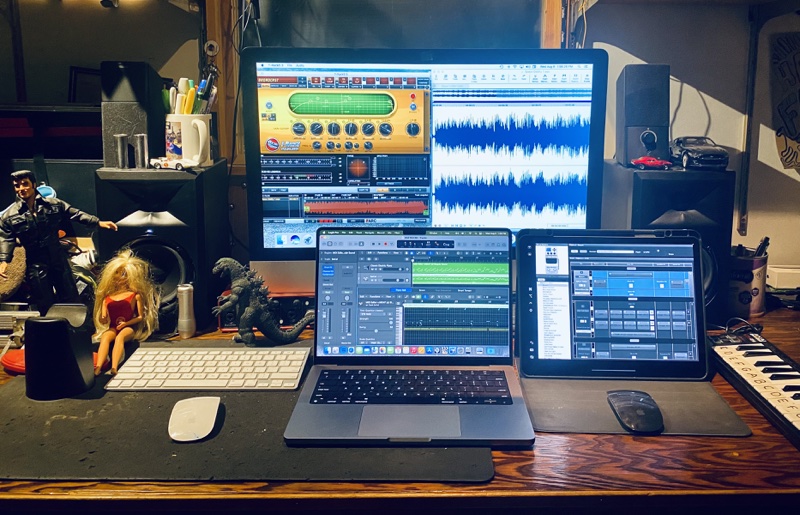 So here's my man cave with my MBP 14' running Logic and mirroring off of it is my iPad Pro 12.9 with my Beatbuddy Program. My 2 favorite programs that I use almost everyday. In the background I've got T-Racks and Sound Forge running on my 2014 iMac.