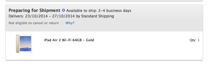 Hm, I placed my order for a Soft Pink Smart case and a 64GB Gold iPad Air 2 Friday evening, but both of them are still processing? I've noticed nearly everyone else that snapped up a case has seen theirs prepare for shipment but mine's lagging behind a bit.