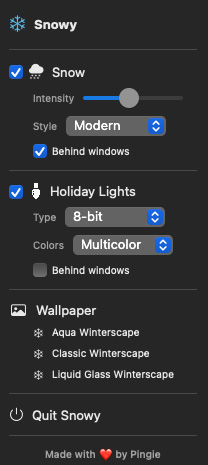New app - Snowy "a delightful menu bar app that adds falling snow and festive holiday lights to your desktop. Free to download"