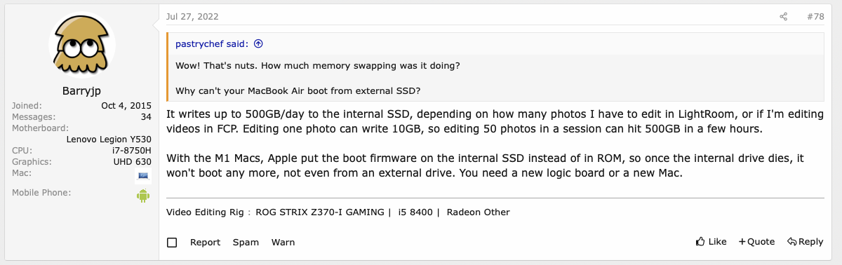Then this clearly is an underspecced system for his use case. My M1 Mac Mini was purchased day one and has 97% life. I write 20GB a day max, often less.The following guy's 18 month old 8GB MacBook Air SSD lifespan is down to 48%.