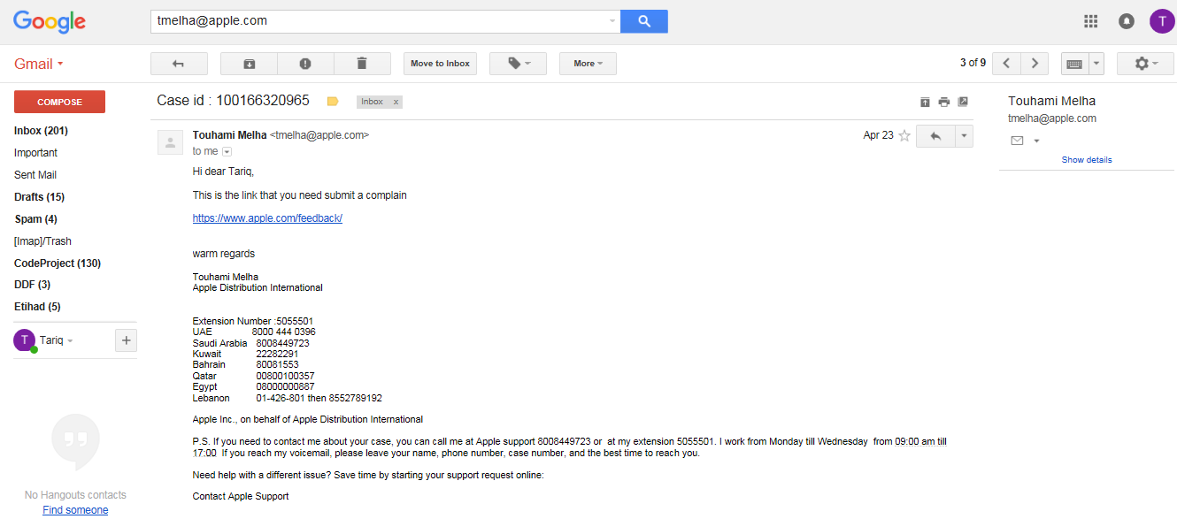 2. Mr. Melha found to be helpless, when it comes to response from Apple Engineer or Apple Technical team. He helped me and provide information how I can complaint about the support issue against the Apple Engineer (name now known). s image from inbox:
