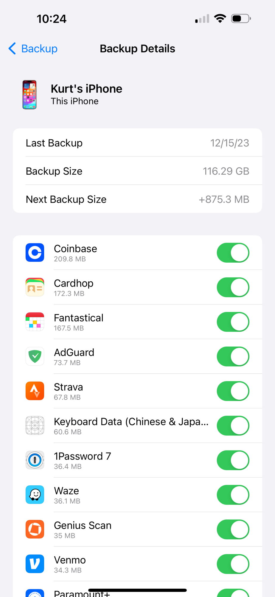 Got a notification the other day that my iPhone hadn't backed up to iCloud in awhile. Went to investigate only to discover the my backups were now over 100GB in size; normally they are around 1.5 GB. Nothing has changed as far as I can tell; seems to have potentially started around iOS 17.2's release. The data in the backup doesn't even remotely add up; Photos and Messages are all stored in iCloud already and shouldn't be backed up; Music is synced from a Mac so same story there. I basically can't back up now since it takes over 20 hours to get that much up to the cloud. Any tips?