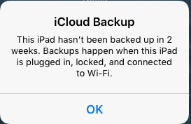 I got this pop-up on our iPad this evening.why oh why doesn't someone make an app that warns you that a backup has failed _immediately after the failure_ and gives you a timestamp of all previous backups?....