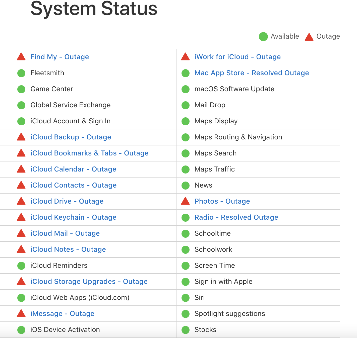 Several of Apple's services are experiencing an outage at the current time, with Apple noting service interrupts for iCloud Backup, iCloud Drive, iCloud Notes, iCloud Storage Upgrades, and Photos on its System Status page.