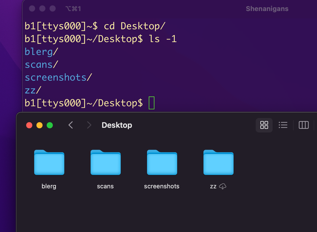 Example: on the other Mac I created an empty folder called "zz" in my Desktop folder which is in iCloud Drive. You can see the cloud-arrow icon thing here in Finder, and the directory listing in the purple window above it via the command shell, proving the "zz" folder is there.