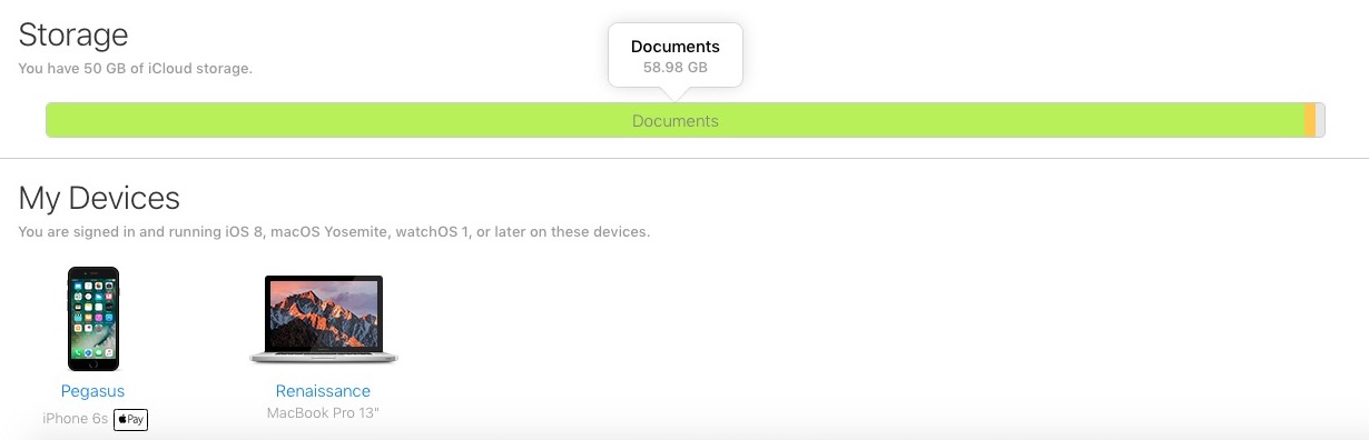 It reports my current usage as being "59GB of 50GB". This is reported on my iPhone 6S and MacBook Pro. I have a 50GB plan for 0.99c a month. But what I don't understand is that it doesn't add up.