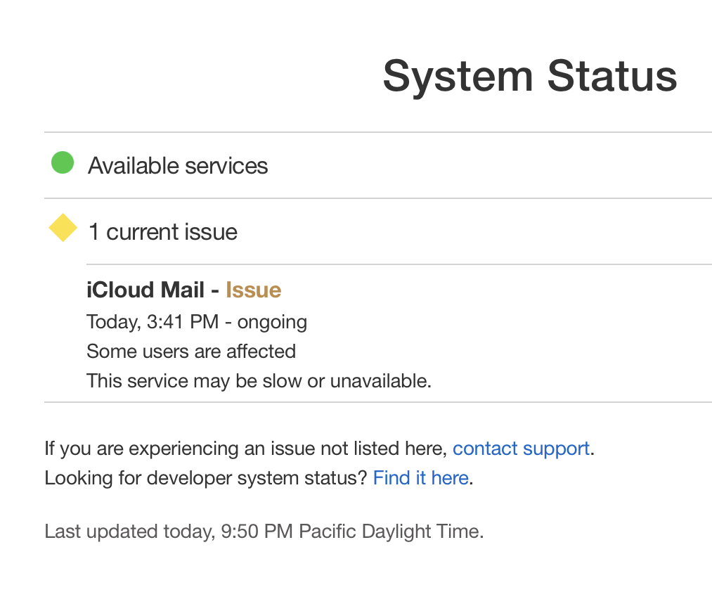 Apple says the iCloud Mail service may be "slow or unavailable," but no other iCloud services are currently listed as affected.