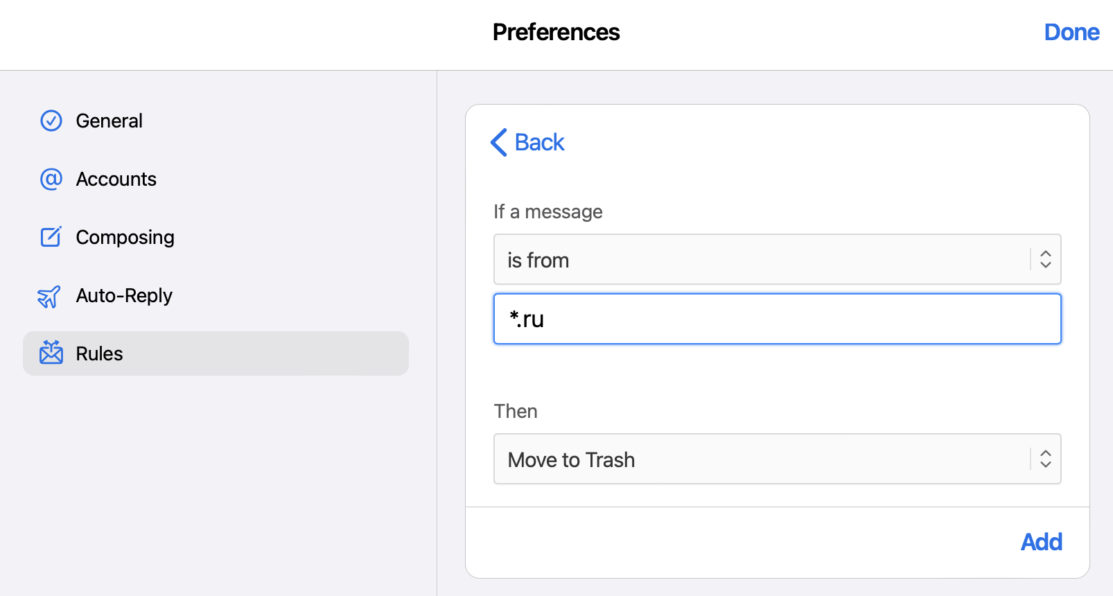 I am trying to block scam/junk mail without success. All the emails originate in Russia with an .ru extension. I want to block all email from Russia period. I don't nor do I ever expect to buy, order or shop online from Russia. How can I do this? TIA