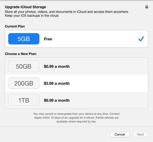 I see this too and I'm trying to go from 200GB to 50GB. 20GB was not enough but for now, 50GB is. Not bad going from $3.99 to $0.99.I know. And showing the old pricing tiers, too. Grrrr. There was a generic icon next to the 99 cent plan too - see screenshot below.