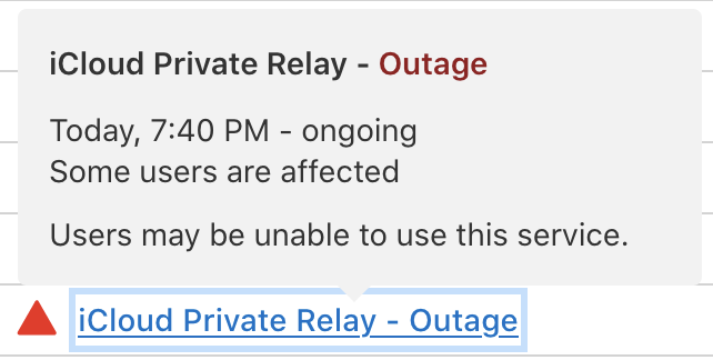 Apple's iCloud Private Relay option is not working for some users, according to Apple's System Status page. The feature is experiencing an outage and is unavailable at the current time.