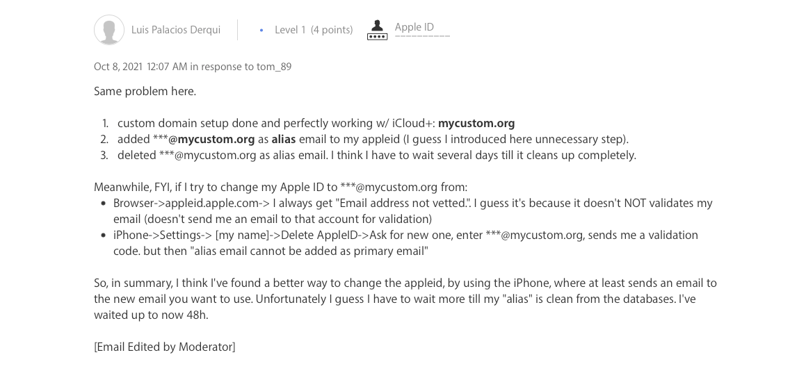 firstname@domain.com alias will somehow be affected by various errors or settings. I'm also not sure if there's any significant difference between AppleID and iCloud accounts...