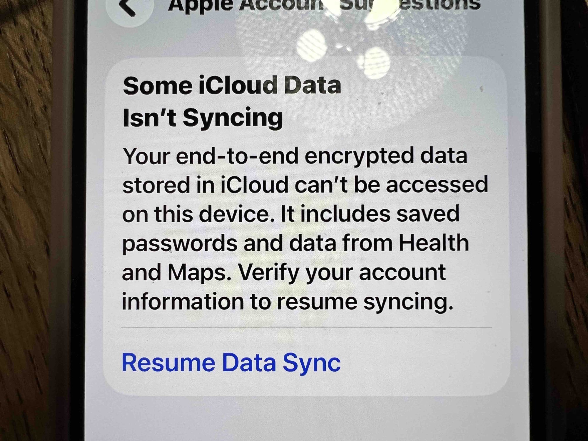 Your end-to-end encrypted data stored in iCloud can't be accessed on this device. It includes saved passwords and data from Health and Maps. Verify your account information to resume syncing.