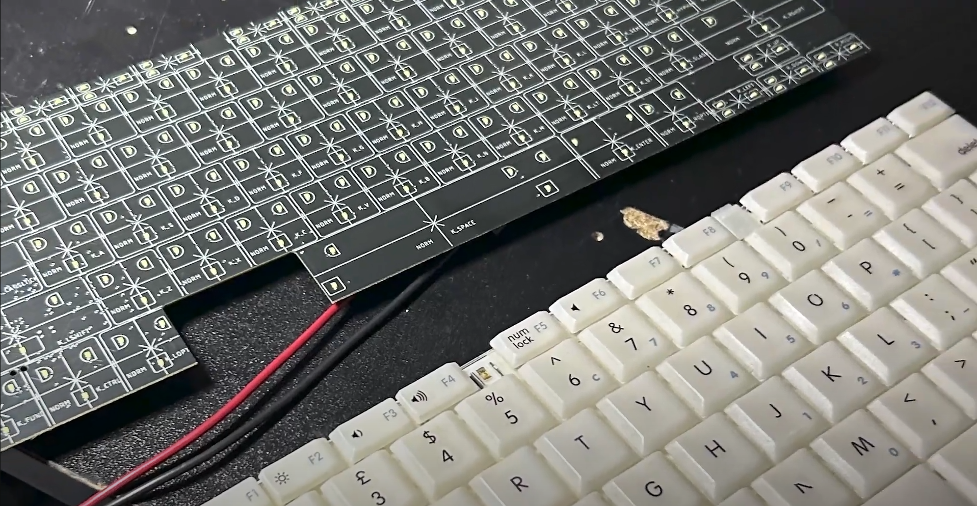 The current PCB has extra LEDs to help me with debugging and testing, which are showing through the casing but they will not be there in the final design. I'm also designing a keyboard lighting PCB to go under the original keyboard and allow per-key lighting for animations - all white LEDs, but I will be able to change the brightness of each at around 100fps for smooth effects. It will respond to keypresses too, so things like rippling light out from keys as they're pressed etc should look cool. This second PCB will use its own microcontroller to handle the animation so it doesn't use any CPU from the Pi. The trackpad, keyboard, backlight and some other aspects are handled by another microcontroller on the logic board also.