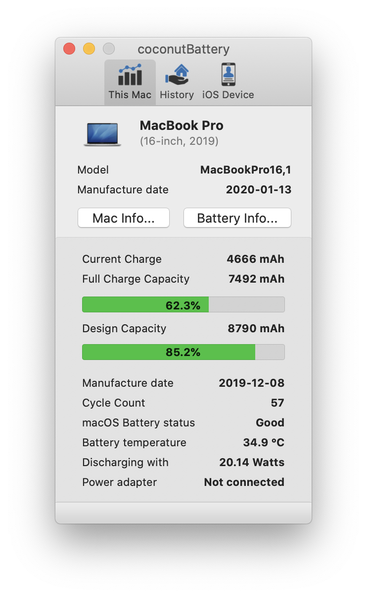 While tolerance errors can always occur, I highly doubt such discrepancies between the MBP 16" users here with 90-92% health after just a few cycles and my MBP 2015 replacement battery with 98-99% health at 50 cycles and 9+ months of age can be explained by your statement. If the Coconut Battery mAh capacity measurement correlates with the corresponding OSX system information value, then there is definetly increased wearout, for whatever reasons, which should be monitored closely.