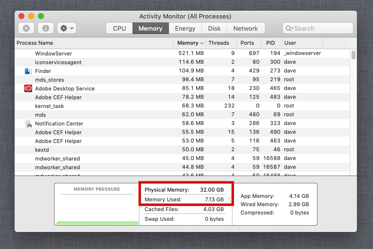 It's easy to check for insufficient RAM. Open "Activity Monitor" and click on the "Memory" tab. Check the "Memory Pressure" graph while performing your work. Green is good, yellow is pushing it, and red is bad. See Dr. Stealth's post (#57) for an example. I wouldn't worry too much about memory used.I'm planning to purchase 32GB of RAM ASAP. I had hoped that the increased processor speed would be enough to compensate for the lower RAM until i upgraded it. I thought worst case it would be as slow as my old computer till the increase in RAM.